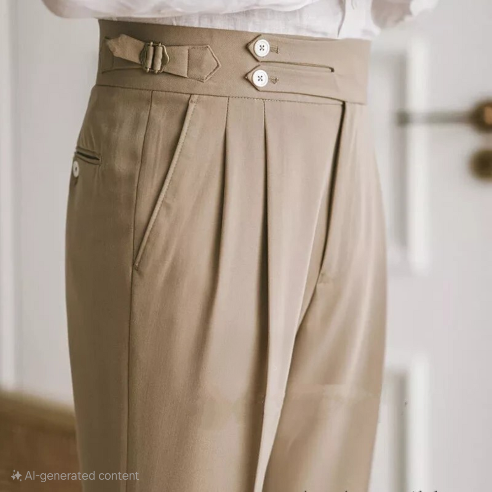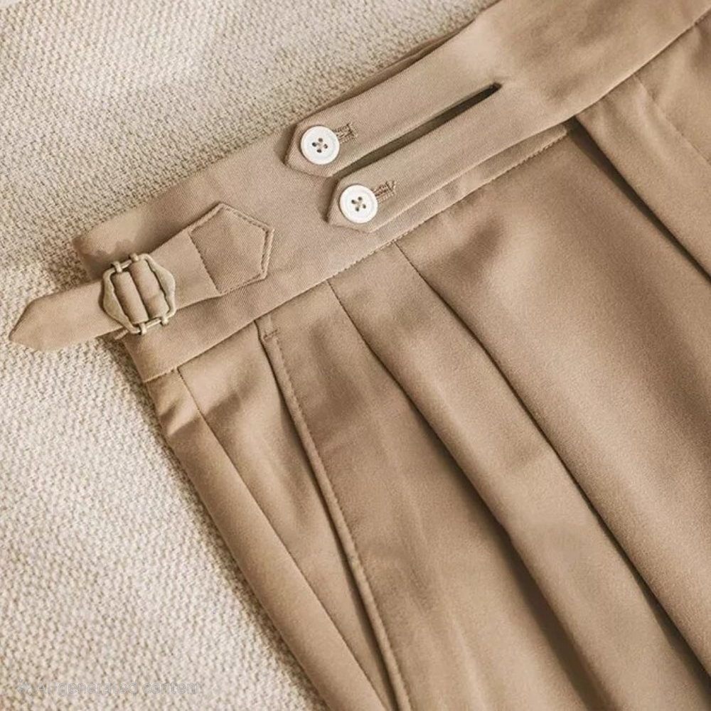 Waistband: Classic Gurkha-style extended waistband with double-button closure and side buckle adjusters for a tailored, adjustable fit.