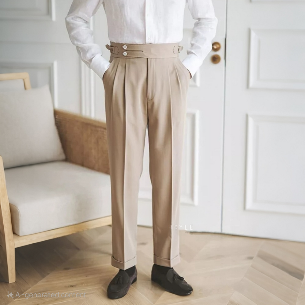 Styling Detail: Paired with a sleek black dress shirt for a sharp contrast, highlighting the trousers' refined design.