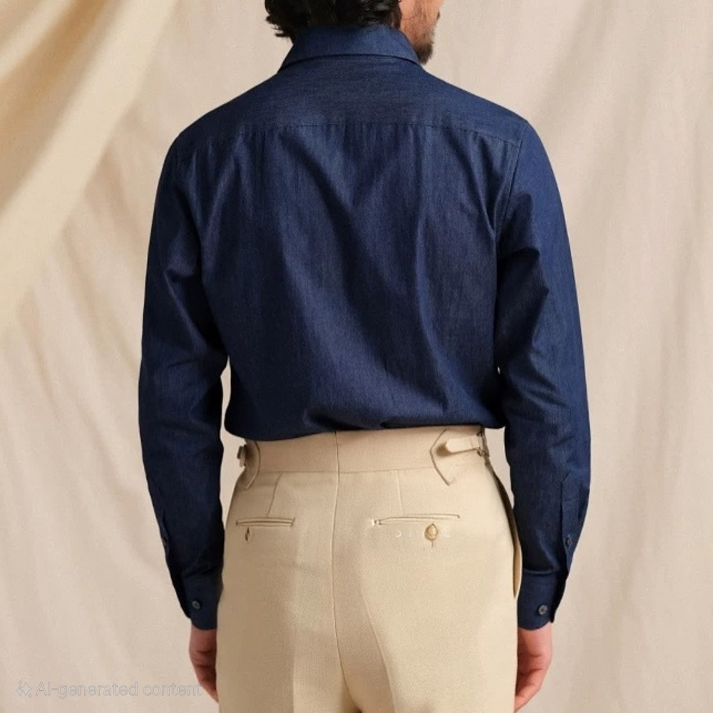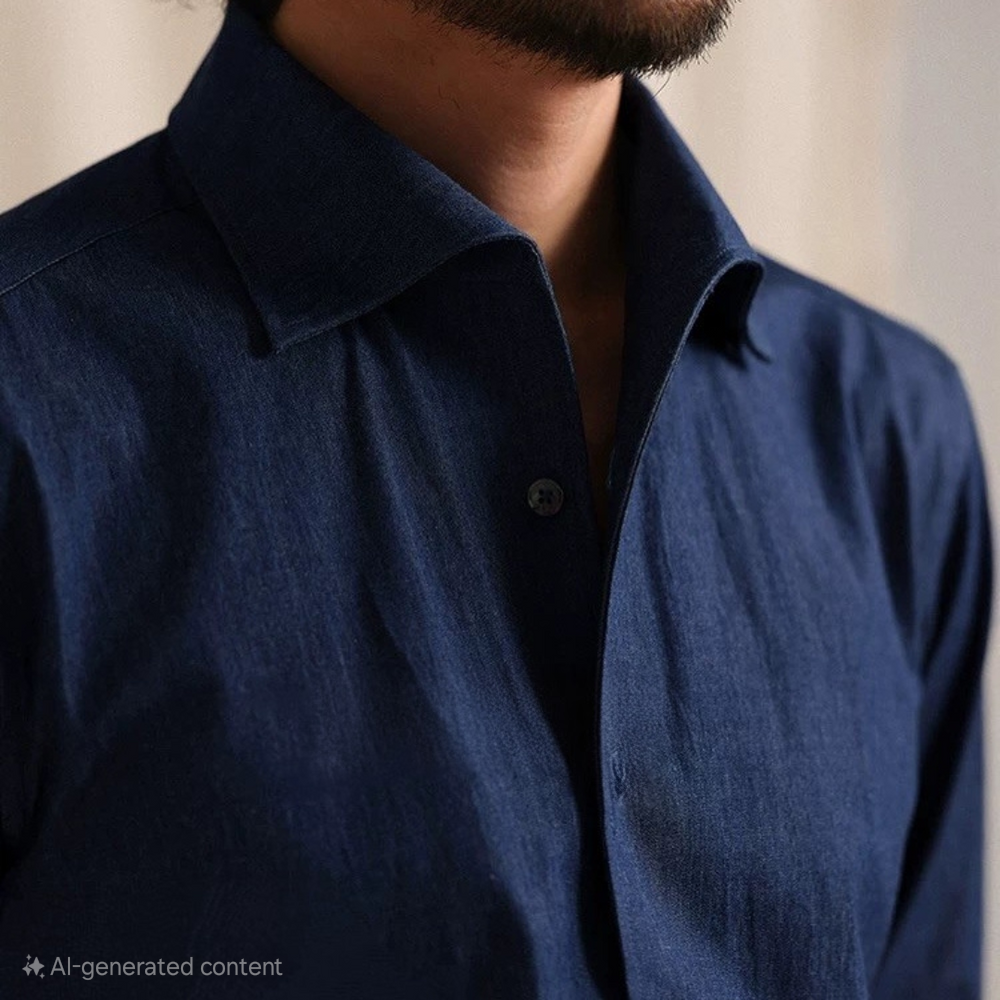 Styling Detail: Patterned inner collar and placket lining visible when slightly unbuttoned